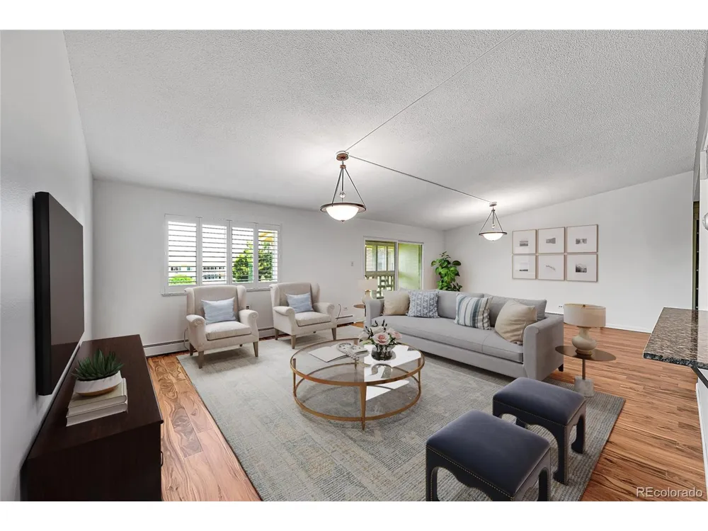 Rare, remodeled 1550 sq ft, 2 bedroom, 2 bath unit with dedicated garage spaces in one of the best 55 year and older communities. The vaulted ceilings provide an airy, sophisticated feel afforded to units only on the fourth floor. Enclosed lanai overlooks professionally landscaped front yard. Newer kitchen with granite countertops, wood floors throughout, with tile in bathrooms and lanai. Large storage closet in unit can be used as an office, and additional storage. Dedicated storage down the all is also included as well as another in one of the garage spaces. Large master bedroom with a spacious walk in closet. 3 AC wall units and ceiling fans. Steps from the Highline Canal, great trail for walking in all seasons. Storm windows with custom shutters throughout. Bus service close by. Minutes from Lowry and Cherry Creek. Many resturants, grocery chains, Costco, Lowe's and much more are all a short drive or walk. On-site Monthly HOA dues include property taxes, heat, water, sewer, trash, 24 hour community response team, on-site association management, activities coordinator. Amenities include onsite restaurant, a popular 9 hole golf course open to the public, a newly remodeled fitness center, indoor and outdoor swimming pools, hot tub, sauna, billiards room, a well stocked and curated library, rooms for sewing, woodworking and painting. A wide variety of clubs, activities, and events are available to residents.